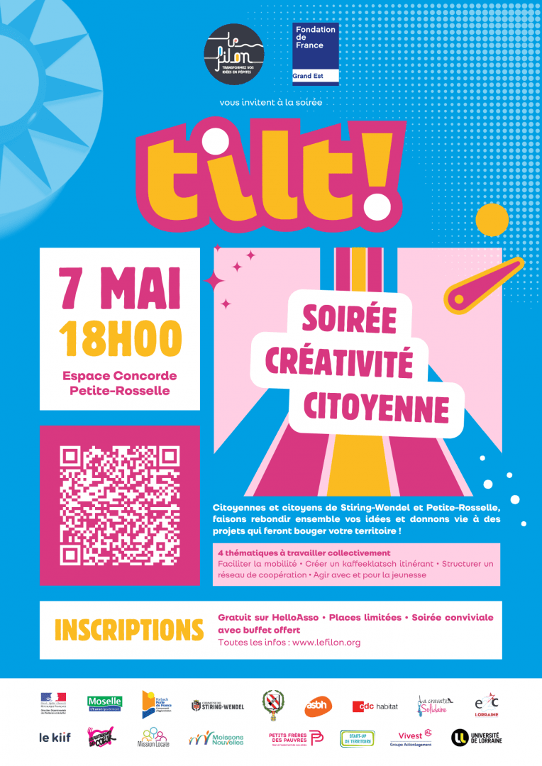 Habitant.e.s de Stiring-Wendel et Petite-Rosselle, Le Filon Moselle et la Fondation de France Grand Est vous invitent à une soirée de coopération citoyenne : la soirée Tilt !